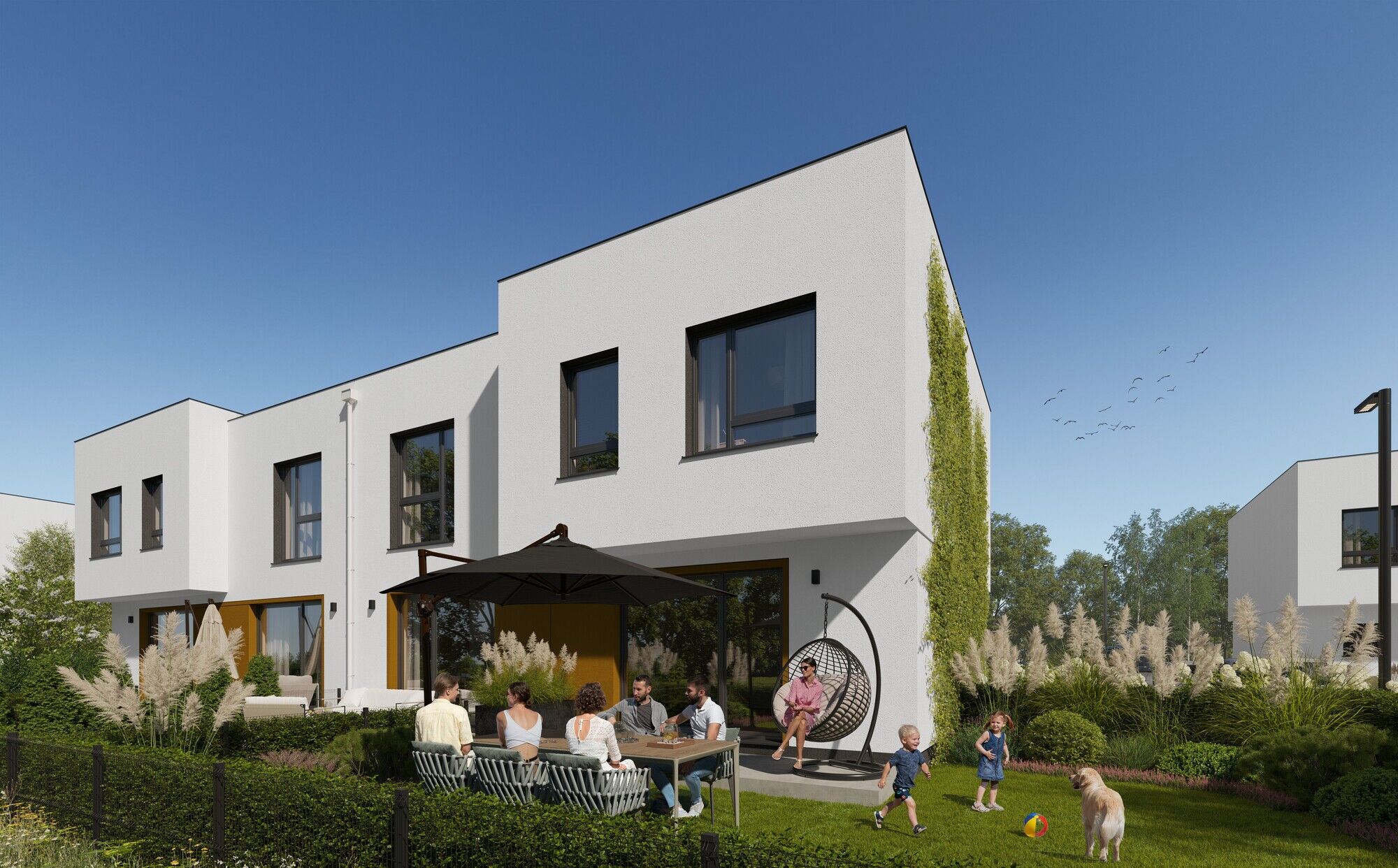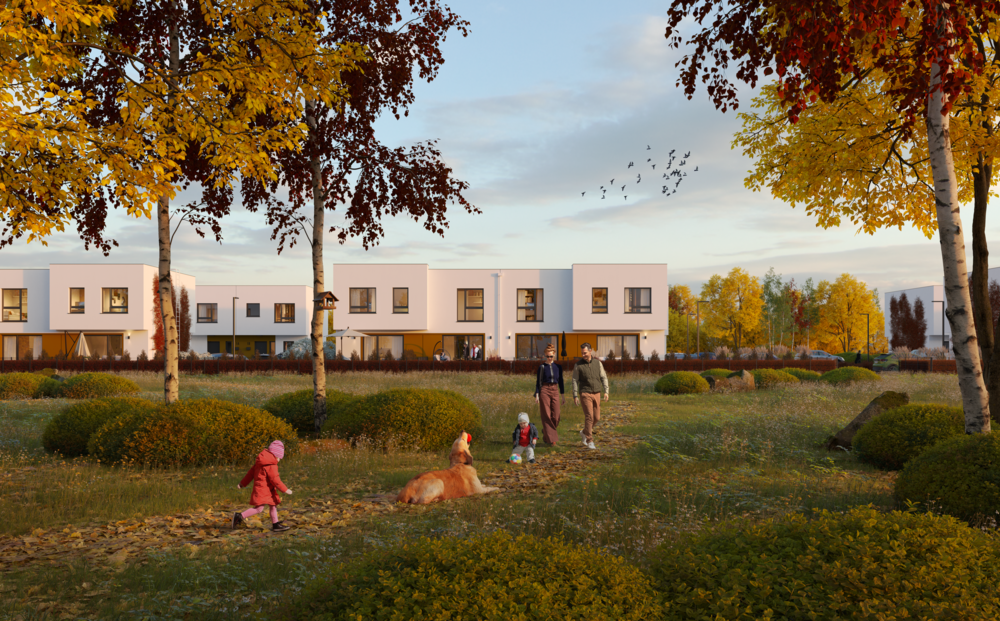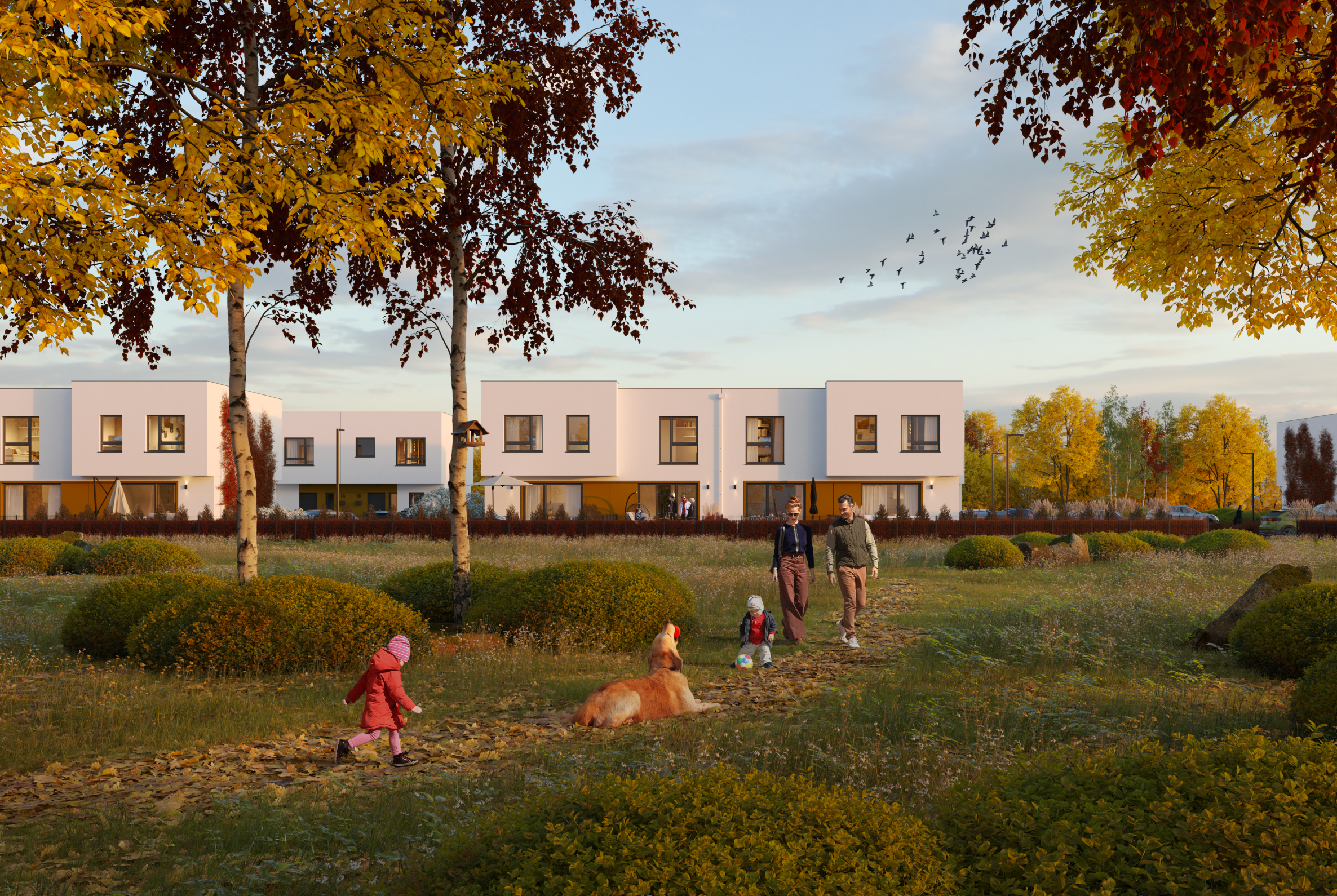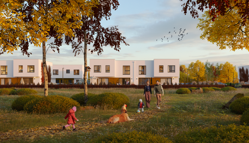 The development includes 60 two-story homes with total areas of 62 or 74 m², each with its own garden. In the central part of the estate, a naturally preserved green zone remains, which gives it a unique character and positively influences the microclimate. A forest grove stretches nearby – here, nature is within easy reach.
