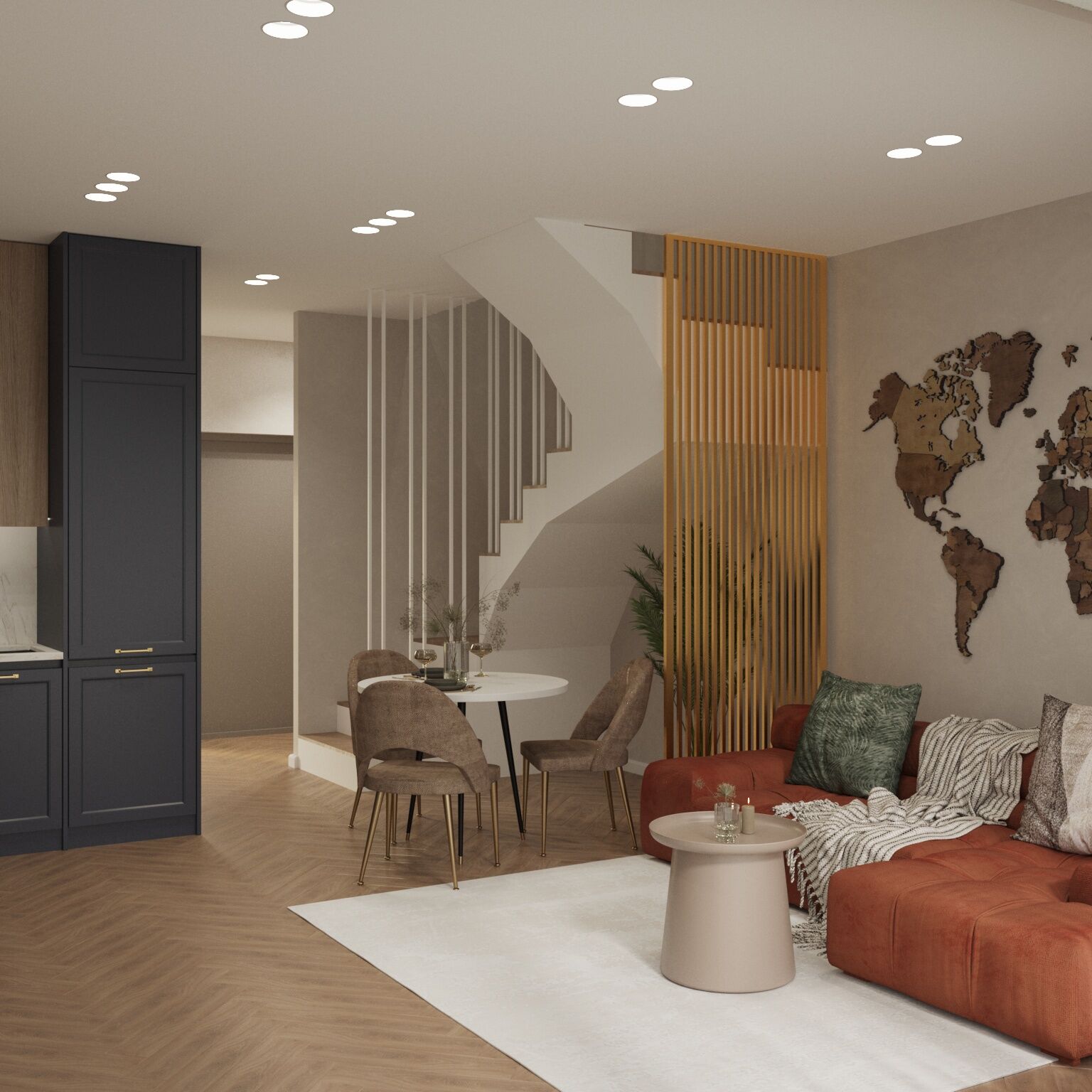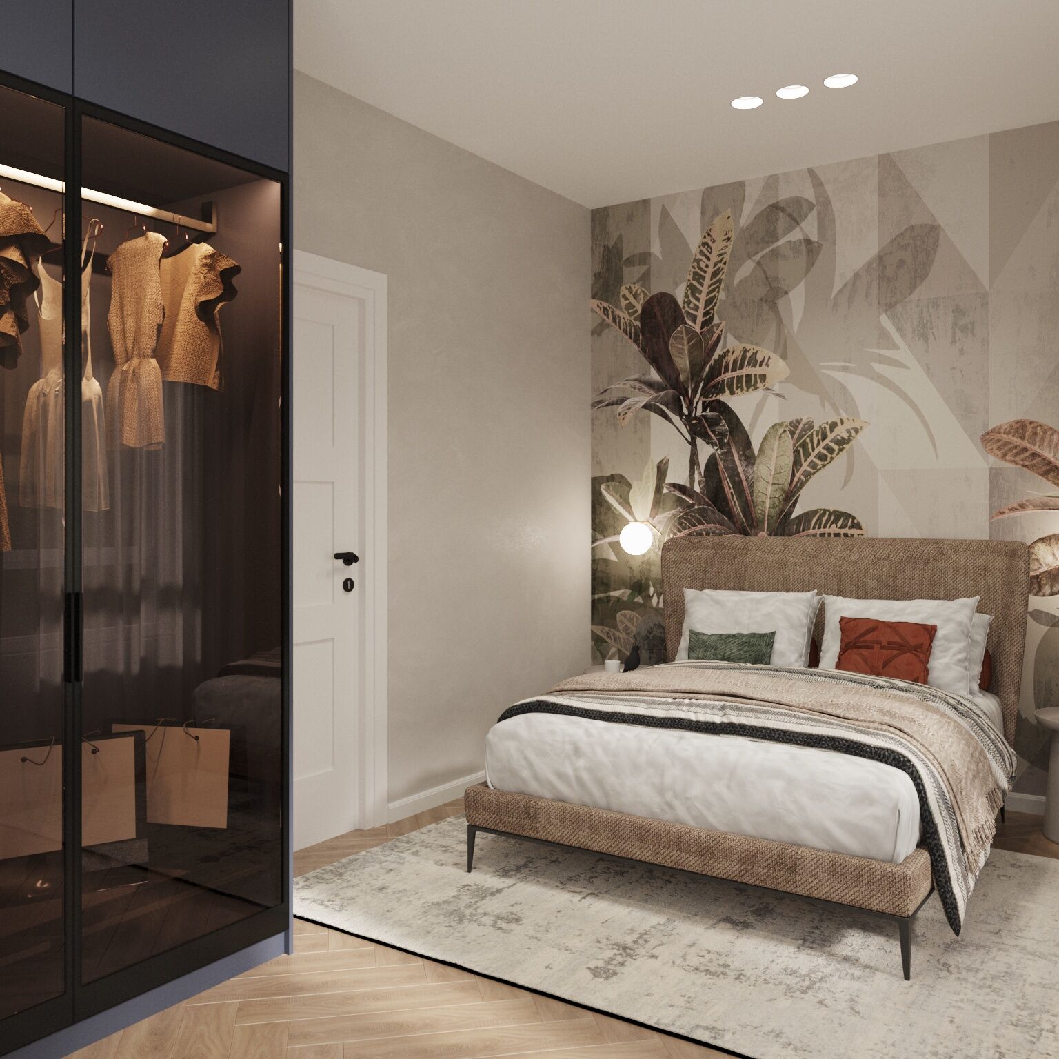 The selection of plants, lighting fixtures, and decorative details ensures comfort and a pleasant perception of the space.