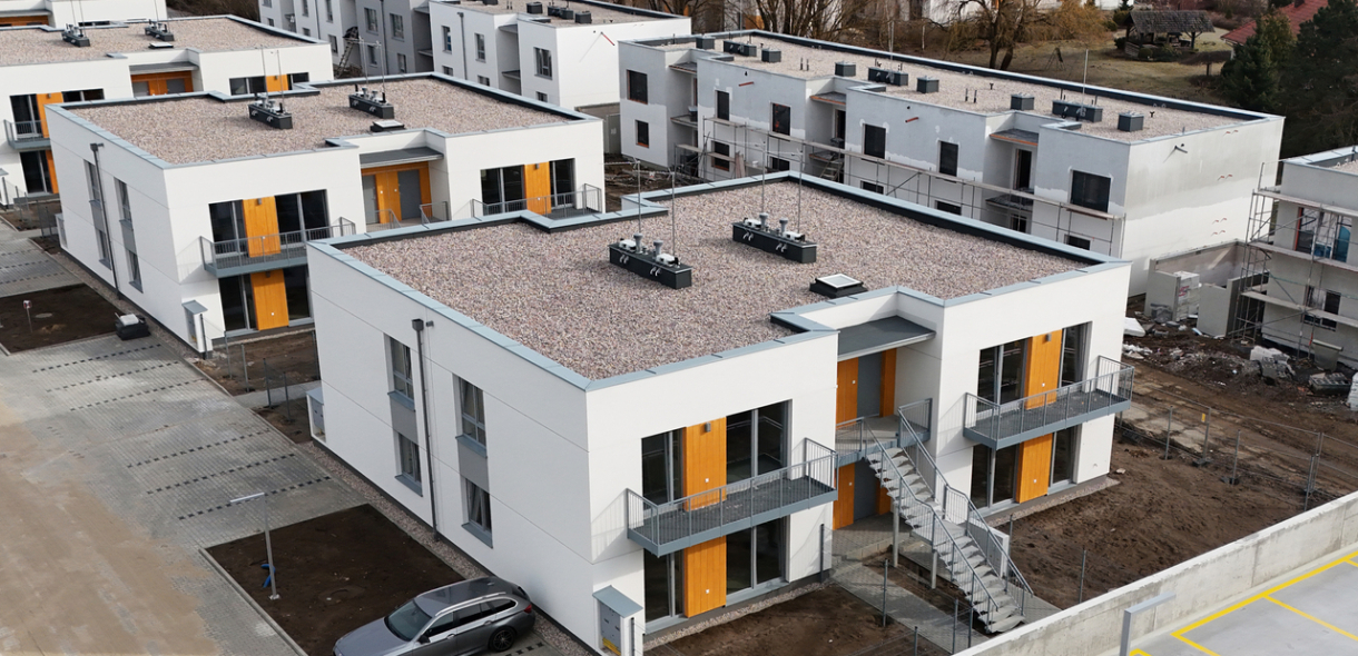 - Etapy 8–10 – zakończyliśmy prace dekarskie i kończymy prace elewacyjne. Wnętrza lokali są już wytynkowane, a my układamy posadzki cementowe.