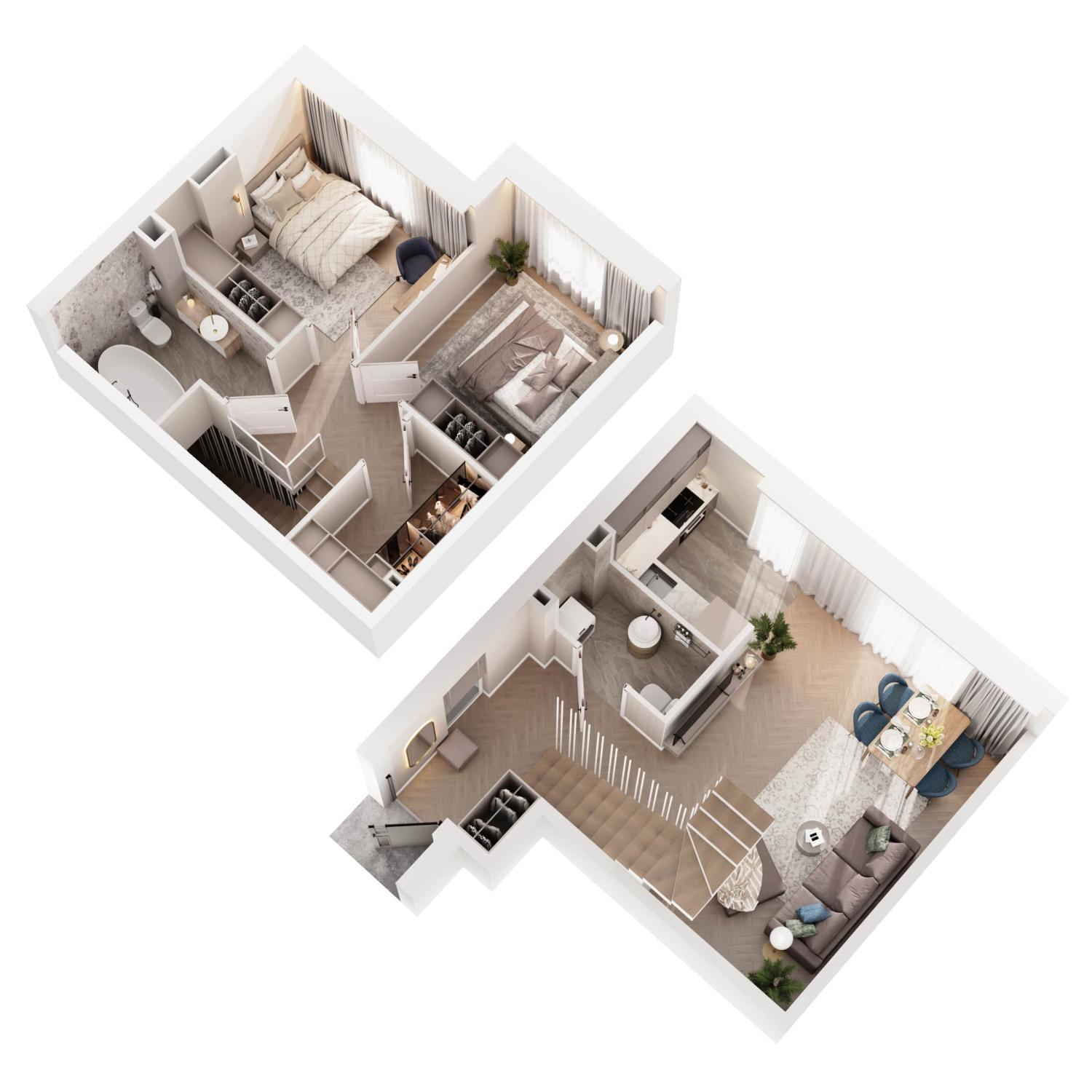 Oferujemy 106 nowoczesnych i komfortowych domów o metrażach od 64 do 82 m2 z przestronnymi ogrodami, zapewniając przyszłym mieszkańcom wygodę i bliskość natury.