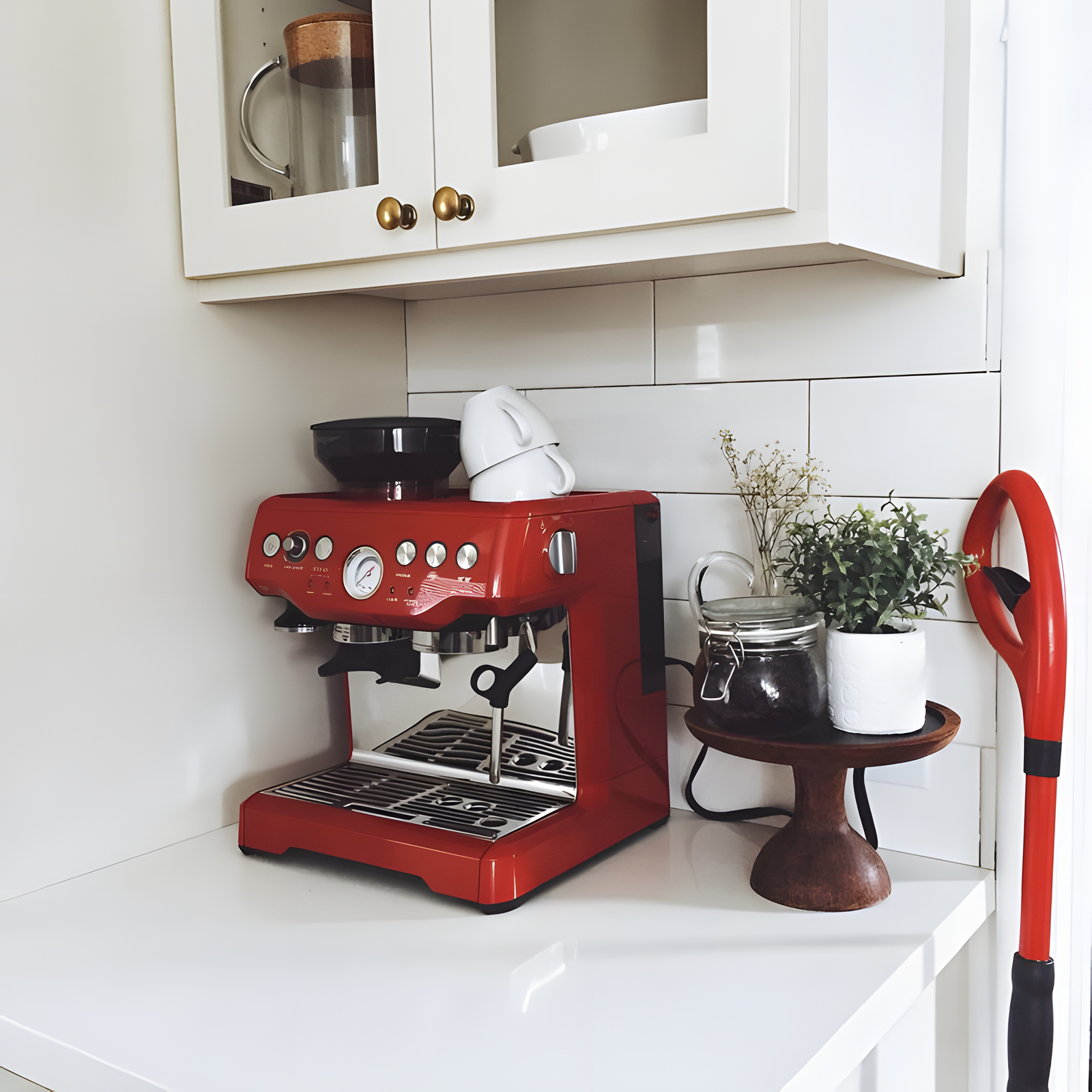 — Красная кофемашина — модная деталь в новом доме.